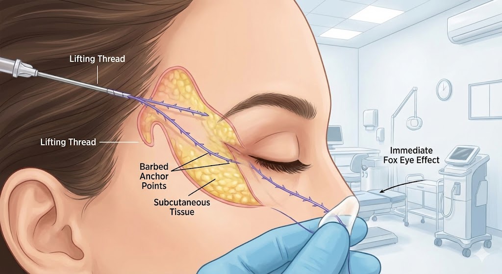 Lokal anestezi altında, saçlı deriden girilen özel iplerle kaşın ve gözün dış kenarının yukarı asılmasıdır.
